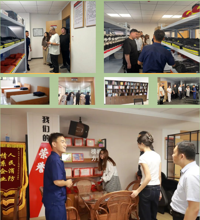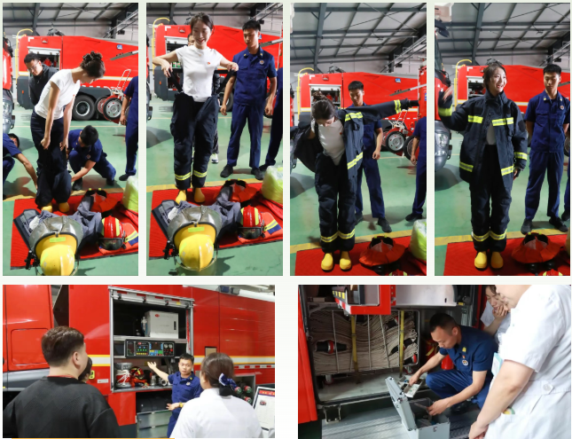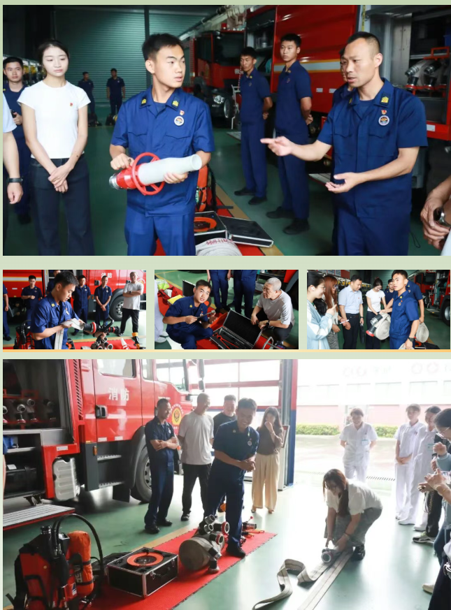 消防队员带领大家参观了营房设施,如班级宿舍、学习室、队员之家、健身房等,深入了解消防救援工作日常、应急处置流程以及消防队员们的英勇事迹、创新成果等,大家深刻感受到了消防队伍严明的纪律和严谨的作风,消防队员们现场还演示了消防器材的使用方法,并邀请大家亲身体验。