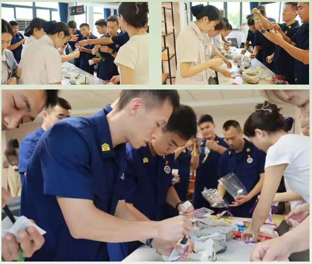 紧接着,大家前往中队食堂,围在一起纷纷动手包起粽子,折粽叶、填糯米、放馅料、扎粽绳,大家手法娴熟,一个个饱满的粽子在手中诞生,粽香弥漫。