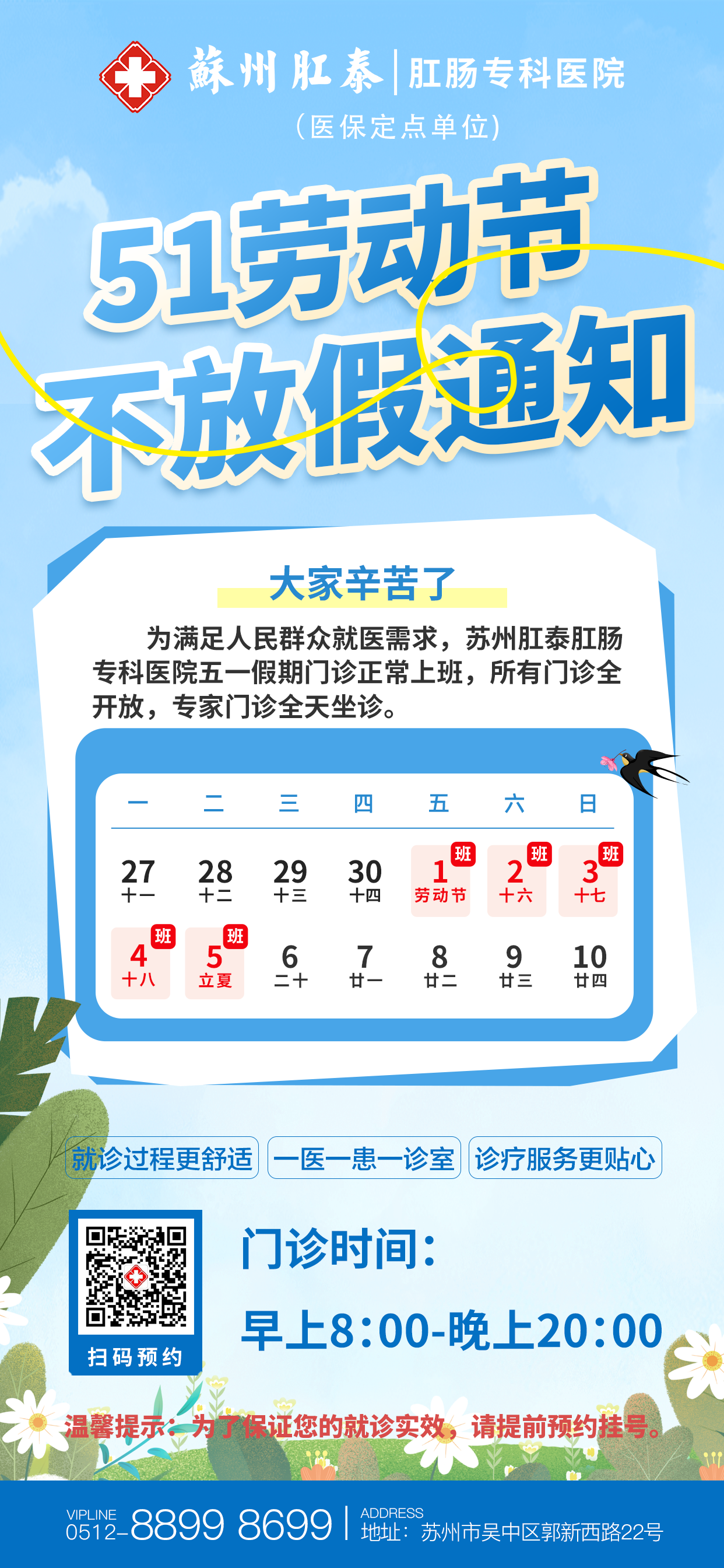五一假期,健康不打烊!苏州肛泰肛肠专科医院以品质服务、放心医疗,为你的肛肠消化健康保驾护航。如需就诊,可提前预约锁定专家号,轻松开启安心诊疗之旅,不负春日好时节,守护全家好健康!